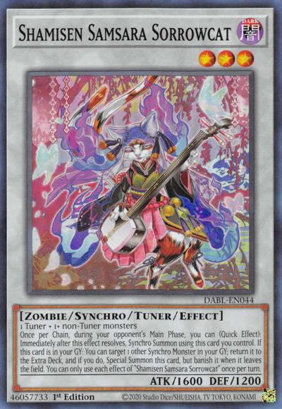 1 Tuner + 1+ non-Tuner monstersOnce per Chain, during your opponent’s Main Phase, you can (Quick Effect): Immediately after this effect resolves, Synchro Summon using this card you control. If this card is in your GY: You can target 1 other Synchro Monster in your GY; return it to the Extra Deck, and if you do, Special Summon this card, but banish it when it leaves the field. You can only use each effect of ‘Shamisen Samsara Sorrowcat’ once per turn.