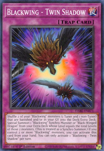 Shuffle 2 of your ‘Blackwing’ monsters (1 Tuner and 1 non-Tuner) that are banished and/or in your GY into the Deck/Extra Deck; Special Summon 1 ‘Blackwing’ Synchro Monster or ‘Black-Winged Dragon’ from your Extra Deck whose Level equals the total Levels of those 2 monsters. (This is treated as a Synchro Summon.) If you control 2 or more ‘Blackwing’ monsters, you can activate this card from your hand. You can only activate 1 ‘Blackwing – Twin Shadow’ per turn.