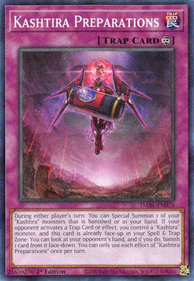 During either player’s turn: You can Special Summon 1 of your ‘Kashtira’ monsters that is banished or in your hand. If your opponent activates a Trap Card or effect, you control a ‘Kashtira’ monster, and this card is already face-up in your Spell & Trap Zone: You can look at your opponent’s hand, and if you do, banish 1 card from it face-down. You can only use each effect of ‘Kashtira Preparations’ once per turn.
