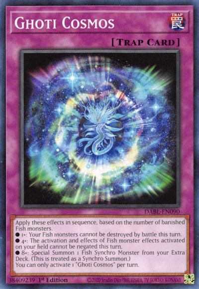 Apply these effects in sequence, based on the number of banished Fish monsters.● 1+: Your Fish monsters cannot be destroyed by battle this turn.● 4+: The activation and effects of Fish monster effects activated on your field cannot be negated this turn.● 8+: Special Summon 1 Fish Synchro Monster from your Extra Deck. (This is treated as a Synchro Summon.)You can only activate 1 ‘Ghoti Cosmos’ per turn.