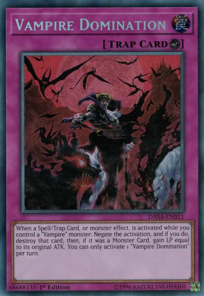 When a Spell/Trap Card, or monster effect, is activated while you control a ‘Vampire’ monster: Negate the activation, and if you do, destroy that card, then, if it was a Monster Card, gain LP equal to its original ATK. You can only activate 1 ‘Vampire Domination’ per turn.