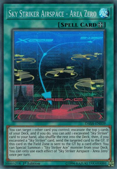 You can target 1 other card you control; excavate the top 3 cards of your Deck, and if you do, you can add 1 excavated ‘Sky Striker’ card to your hand, also shuffle the rest into the Deck, then, if you excavated a ‘Sky Striker’ card, send the targeted card to the GY. If this card in the Field Zone is sent to the GY by a card effect: You can Special Summon 1 ‘Sky Striker Ace’ monster from your Deck. You can only use each effect of ‘Sky Striker Airspace – Area Zero’ once per turn.