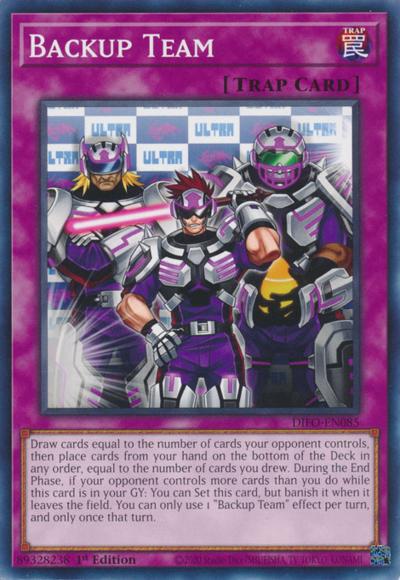 Draw cards equal to the number of cards your opponent controls, then place cards from your hand on the bottom of the Deck in any order, equal to the number of cards you drew. During the End Phase, if your opponent controls more cards than you do while this card is in your GY: You can Set this card, but banish it when it leaves the field. You can only use 1 ‘Backup Team’ effect per turn, and only once that turn.