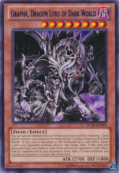 You can Special Summon this card (from your Graveyard) by returning 1 ‘Dark World’ monster you control to the hand, except ‘Grapha, Dragon Lord of Dark World’. If this card is discarded to the Graveyard by a card effect: Target 1 card your opponent controls; destroy that target, then, if this card was discarded from your hand to your Graveyard by an opponent’s card effect, look at 1 random card in your opponent’s hand, then, if it was a monster, you can Special Summon it to your side of the field.