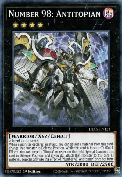 2 Level 4 monstersWhen any player’s monster declares an attack: You can detach 1 Xyz Material from this card; change that monster to Defense Position. During either player’s turn, while this card is in your Graveyard: You can target 1 ‘Utopia’ monster on the field; Special Summon this card in Defense Position, and if you do, attach that monster to this card as an Xyz Material. You can only use this effect of ‘Number 98: Antitopian’ once per turn.