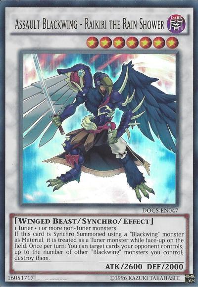 1 Tuner + 1 or more non-Tuner monstersIf this card is Synchro Summoned using a ‘Blackwing’ monster as Material, it is treated as a Tuner monster while face-up on the field. Once per turn: You can target cards your opponent controls, up to the number of other ‘Blackwing’ monsters you control; destroy them.