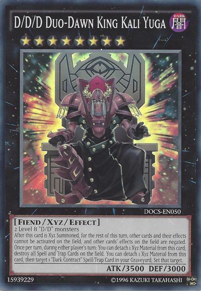 2 Level 8 ‘D/D’ monstersAfter this card is Xyz Summoned, for the rest of this turn, other cards and their effects cannot be activated on the field, and other cards’ effects on the field are negated. Once per turn, during either player’s turn: You can detach 1 Xyz Material from this card; destroy all Spell and Trap Cards on the field. You can detach 1 Xyz Material from this card, then target 1 ‘Dark Contract’ Spell/Trap Card in your Graveyard; Set that target.