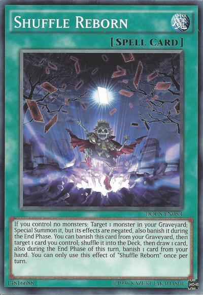If you control no monsters: Target 1 monster in your GY; Special Summon it, but it has its effects negated, also banish it during the End Phase. You can banish this card from your GY, then target 1 card you control; shuffle it into the Deck, then draw 1 card, also during the End Phase of this turn, banish 1 card from your hand. You can only use this effect of ‘Shuffle Reborn’ once per turn.