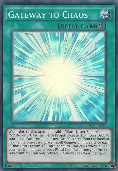 When this card is activated: Add 1 ‘Black Luster Soldier’ Ritual Monster or 1 ‘Gaia The Fierce Knight’ monster from your Deck to your hand. Each time a Monster Card(s) is sent from the hand or field to the GY, place 1 Spell Counter on this card for each of those cards (max. 6). Once per turn: You can remove 3 Spell Counters from this card; add 1 Ritual Spell from your Deck to your hand. You can only activate 1 ‘Gateway to Chaos’ per turn.