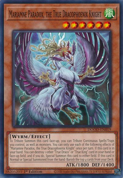 To Tribute Summon this card face-up, you can Tribute Continuous Spells/Traps you control, as well as monsters. You can only use each of the following effects of ‘Mariamne Paradox, the True Dracophoenix Knight’ once per turn. If this card is in your hand: You can destroy 1 other ‘True Draco’ or ‘True King’ card in your hand or face-up field, and if you do, Special Summon this card to either field. If this card is Normal or Special Summoned from the hand: Banish the top 4 cards from your Deck.