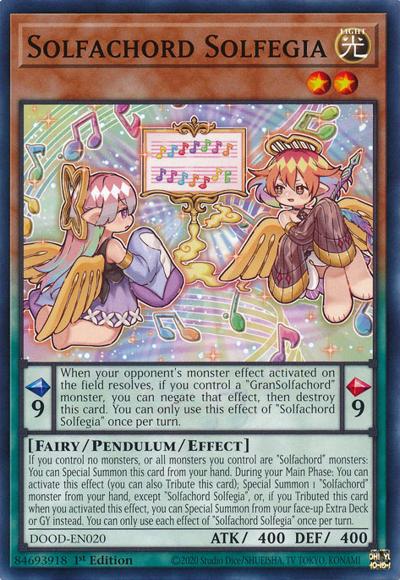 [ Pendulum Effect ] When your opponent’s monster effect activated on the field resolves, if you control a ‘GranSolfachord’ monster, you can negate that effect, then destroy this card. You can only use this effect of ‘Solfachord Solfegia’ once per turn.[ Monster Effect ] If you control no monsters, or all monsters you control are ‘Solfachord’ monsters: You can Special Summon this card from your hand. During your Main Phase: You can activate this effect (you can also Tribute this card); Special Summon 1 ‘Solfachord’ monster from your hand, except ‘Solfachord Solfegia’, or, if you Tributed this card when you activated this effect, you can Special Summon from your face-up Extra Deck or GY instead. You can only use each effect of ‘Solfachord Solfegia’ once per turn.