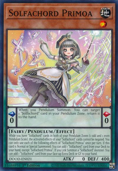 [ Pendulum Effect ] When you Pendulum Summon: You can target 1 ‘Solfachord’ card in your Pendulum Zone; return it to the hand.[ Monster Effect ] While you have ‘Solfachord’ cards in both of your Pendulum Zones (1 odd and 1 even Pendulum Scale), the activated effects of your ‘Solfachord’ cards cannot be negated. You can only use each of the following effects of ‘Solfachord Primoa’ once per turn. If this card is Normal or Special Summoned: You can add 1 ‘Solfachord’ card from your Deck to your hand, except ‘Solfachord Primoa’. If you Link Summon a ‘Solfachord’ monster: You can add 1 ‘Solfachord’ card from your face-up Extra Deck or GY to your hand.