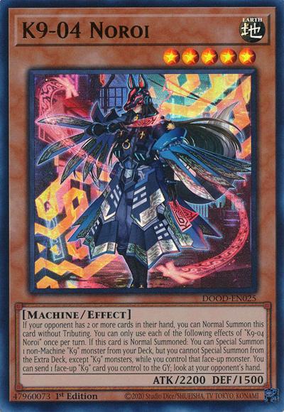If your opponent has 2 or more cards in their hand, you can Normal Summon this card without Tributing. You can only use each of the following effects of ‘K9-04 Noroi’ once per turn. If this card is Normal Summoned: You can Special Summon 1 non-Machine ‘K9’ monster from your Deck, but you cannot Special Summon from the Extra Deck, except ‘K9’ monsters, while you control that face-up monster. You can send 1 face-up ‘K9’ card you control to the GY; look at your opponent’s hand.