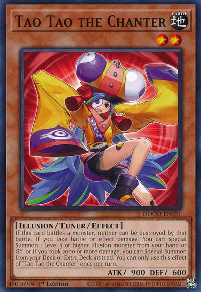 If this card battles a monster, neither can be destroyed by that battle. If you take battle or effect damage: You can Special Summon 1 Level 3 or higher Illusion monster from your hand or GY, or if you took 2000 or more damage, you can Special Summon from your Deck or Extra Deck instead. You can only use this effect of ‘Tao Tao the Chanter’ once per turn.