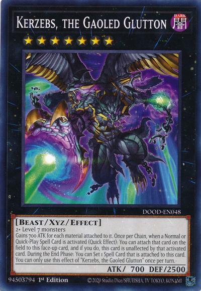 Gains 700 ATK for each material attached to it. Once per Chain, when a Normal or Quick-Play Spell Card is activated (Quick Effect): You can attach that card on the field to this face-up card, and if you do, this card is unaffected by that activated card. During the End Phase: You can Set 1 Spell Card that is attached to this card. You can only use this effect of ‘Kerzebs, the Gaoled Glutton’ once per turn.