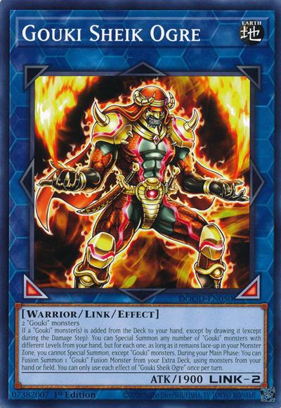 If a ‘Gouki’ monster(s) is added from the Deck to your hand, except by drawing it (except during the Damage Step): You can Special Summon any number of ‘Gouki’ monsters with different Levels from your hand, but for each one, as long as it remains face-up in your Monster Zone, you cannot Special Summon, except ‘Gouki’ monsters. During your Main Phase: You can Fusion Summon 1 ‘Gouki’ Fusion Monster from your Extra Deck, using monsters from your hand or field. You can only use each effect of ‘Gouki Sheik Ogre’ once per turn.