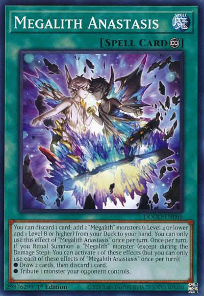 You can discard 1 card; add 2 ‘Megalith’ monsters (1 Level 4 or lower and 1 Level 8 or higher) from your Deck to your hand. You can only use this effect of ‘Megalith Anastasis’ once per turn. Once per turn, if you Ritual Summon a ‘Megalith’ monster (except during the Damage Step): You can activate 1 of these effects (but you can only use each of these effects of ‘Megalith Anastasis’ once per turn);