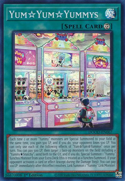 Each time 2 or more ‘Yummy’ monsters are Special Summoned to your field at the same time, you gain 500 LP, and if you do, your opponent loses 500 LP. You can only use each of the following effects of ‘Yum☆Yum☆Yummys’ once per turn. You can pay 500 LP, then target 2 face-up monsters on the field including a ‘Yummy★Snatchy’; send both to the GY, and if you do, Special Summon 1 ‘Yummy’ Synchro Monster from your Extra Deck (this is treated as a Synchro Summon). If your opponent activates a card or effect (except during the Damage Step): You can pay 100 LP; immediately after this effect resolves, Link Summon 1 ‘Yummy’ Link Monster.