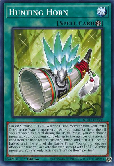 Fusion Summon 1 EARTH Warrior Fusion Monster from your Extra Deck, using Warrior monsters from your hand or field, then if you activated this card during the Battle Phase, you can choose monsters your opponent controls, up to the number of materials used from the hand for this Fusion Summon, and their ATK become halved until the end of the Battle Phase. You cannot declare attacks the turn you activate this card, except with EARTH Warrior monsters. You can only activate 1 ‘Hunting Horn’ per turn.