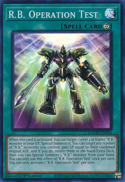 When this card is activated: You can target 1 Level 3 or higher ‘R.B.’ monster in your GY; Special Summon it. You can target any number of ‘R.B.’ monsters you control; gain LP equal to their combined original ATK, and if you do, return them to the hand/Extra Deck, then you can Special Summon 1 ‘R.B.’ monster from your hand. You can only use this effect of ‘R.B. Operation Test’ once per turn. You can only activate 1 ‘R.B. Operation Test’ per turn.
