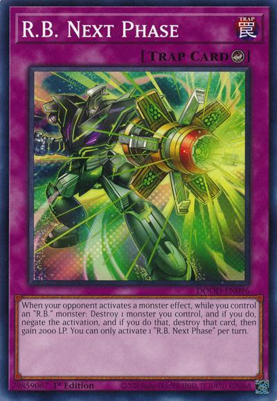 When your opponent activates a monster effect, while you control an ‘R.B.’ monster: Destroy 1 monster you control, and if you do, negate the activation, and if you do that, destroy that card, then gain 2000 LP. You can only activate 1 ‘R.B. Next Phase’ per turn.