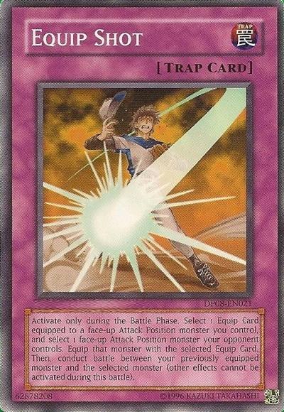 Activate only during the Battle Phase. Select 1 Equip Card equipped to a face-up Attack Position monster you control, and select 1 face-up Attack Position monster your opponent controls. Equip that monster with the selected Equip Card. Then, conduct battle between your previously equipped monster and the selected monster (other effects cannot be activated during this battle).