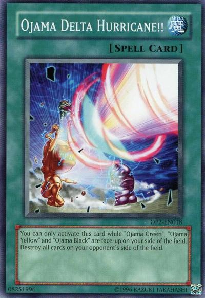 You can only activate this card while ‘Ojama Green’, ‘Ojama Yellow’ and ‘Ojama Black’ are face-up on your side of the field. Destroy all cards on your opponent’s side of the field.