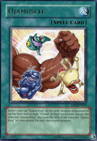 (This card is always treated as a ‘Ojama’ card.)Select 1 face-up ‘Ojama King’. Destroy all ‘Ojama’ monsters on the field, except the selected ‘Ojama King’. It gains 1000 ATK for each monster destroyed this way.