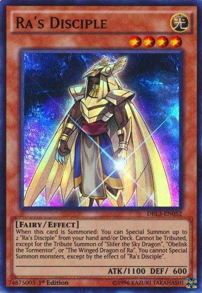 When this card is Summoned: You can Special Summon up to 2 ‘Ra’s Disciple’ from your hand and/or Deck. Cannot be Tributed, except for the Tribute Summon of ‘Slifer the Sky Dragon’, ‘Obelisk the Tormentor’, or ‘The Winged Dragon of Ra’. You cannot Special Summon monsters, except by the effect of ‘Ra’s Disciple’.