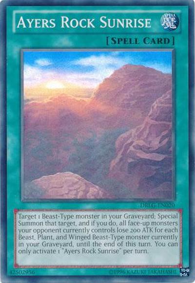 Target 1 Beast-Type monster in your Graveyard; Special Summon that target, and if you do, all face-up monsters your opponent currently controls lose 200 ATK for each Beast, Plant, and Winged Beast-Type monster currently in your Graveyard, until the end of this turn. You can only activate 1 ‘Ayers Rock Sunrise’ per turn.