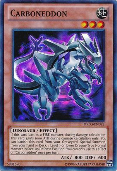 If this card battles a FIRE monster, during damage calculation: This card gains 1000 ATK during damage calculation only. You can banish this card from your Graveyard; Special Summon, from your hand or Deck, 1 Level 7 or lower Dragon-Type Normal Monster in face-up Defense Position. You can only use this effect of ‘Carboneddon’ once per turn.