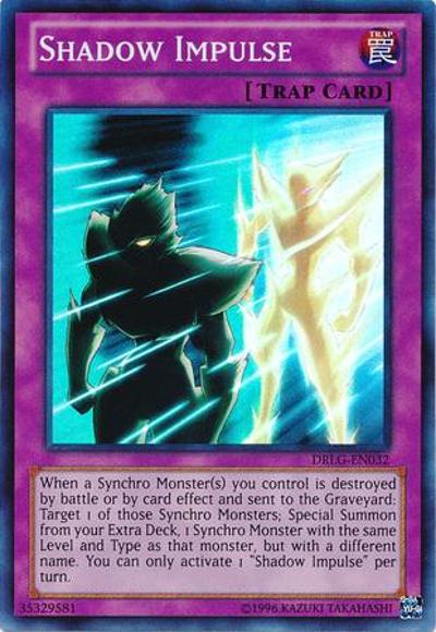 When a Synchro Monster(s) you control is destroyed by battle or by card effect and sent to the Graveyard: Target 1 of those Synchro Monsters; Special Summon from your Extra Deck, 1 Synchro Monster with the same Level and Type as that monster, but with a different name. You can only activate 1 ‘Shadow Impulse’ per turn.