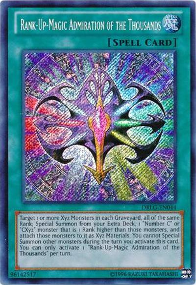 Target 1 or more Xyz Monsters in each Graveyard, all of the same Rank; Special Summon from your Extra Deck, 1 ‘Number C’ or ‘CXyz’ monster that is 1 Rank higher than those monsters, and attach those monsters to it as Xyz Materials. You cannot Special Summon other monsters during the turn you activate this card. You can only activate 1 ‘Rank-Up-Magic Admiration of the Thousands’ per turn.