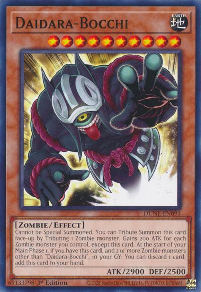 Cannot be Special Summoned. You can Tribute Summon this card face-up by Tributing 1 Zombie monster. Gains 200 ATK for each Zombie monster you control, except this card. At the start of your Main Phase 1, if you have this card, and 2 or more Zombie monsters other than ‘Daidara-Bocchi’, in your GY: You can discard 1 card; add this card to your hand.