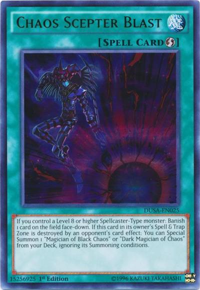 If you control a Level 8 or higher Spellcaster-Type monster: Banish 1 card on the field face-down. If this card in its owner’s Spell & Trap Zone is destroyed by an opponent’s card effect: You can Special Summon 1 ‘Magician of Black Chaos’ or ‘Dark Magician of Chaos’ from your Deck, ignoring its Summoning conditions.