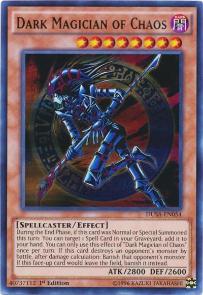 During the End Phase, if this card was Normal or Special Summoned this turn: You can target 1 Spell in your GY; add it to your hand. You can only use this effect of ‘Dark Magician of Chaos’ once per turn. If this card destroys an opponent’s monster by battle, after damage calculation: Banish that opponent’s monster. If this face-up card would leave the field, banish it instead.