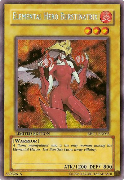 A flame manipulator who was the first Elemental HERO woman. Her Burstfire burns away villainy.