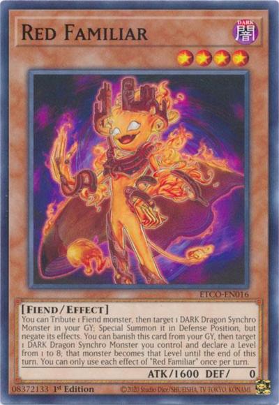 You can Tribute 1 Fiend monster, then target 1 DARK Dragon Synchro Monster in your GY; Special Summon it in Defense Position, but negate its effects. You can banish this card from your GY, then target 1 DARK Dragon Synchro Monster you control and declare a Level from 1 to 8; that monster becomes that Level until the end of this turn. You can only use each effect of ‘Red Familiar’ once per turn.