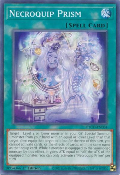 Target 1 Level 4 or lower monster in your GY; Special Summon 1 monster from your hand with an equal or lower Level than that target, then equip that target to it, but for the rest of this turn, you cannot activate cards, or the effects of cards, with the same name as that equip card. While a monster is equipped to the Summoned monster by this effect, it gains ATK equal to half the ATK of the equipped monster. You can only activate 1 ‘Necroquip Prism’ per turn.