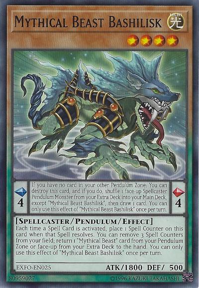 Pendulum EffectIf you have no card in your other Pendulum Zone: You can destroy this card, and if you do, shuffle 1 face-up Spellcaster Pendulum Monster from your Extra Deck into your Main Deck, except ‘Mythical Beast Bashilisk’, then draw 1 card. You can only use this effect of ‘Mythical Beast Bashilisk’ once per turn.Monster EffectEach time a Spell Card is activated, place 1 Spell Counter on this card when that Spell resolves. You can remove 3 Spell Counters from your field; return 1 ‘Mythical Beast’ card from your Pendulum Zone or face-up from your Extra Deck to the hand. You can only use this effect of ‘Mythical Beast Bashilisk’ once per turn.