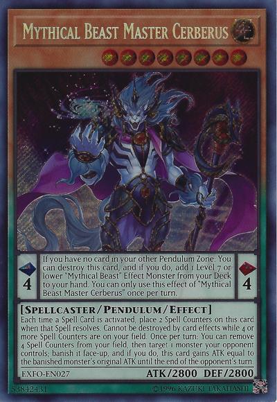 Pendulum EffectIf you have no card in your other Pendulum Zone: You can destroy this card, and if you do, add 1 Level 7 or lower ‘Mythical Beast’ Effect Monster from your Deck to your hand. You can only use this effect of ‘Mythical Beast Master Cerberus’ once per turn.Monster EffectEach time a Spell Card is activated, place 2 Spell Counters on this card when that Spell resolves. Cannot be destroyed by card effects while 4 or more Spell Counters are on your field. Once per turn: You can remove 4 Spell Counters from your field, then target 1 monster your opponent controls; banish it face-up, and if you do, this card gains ATK equal to the banished monster’s original ATK until the end of the opponent’s turn.