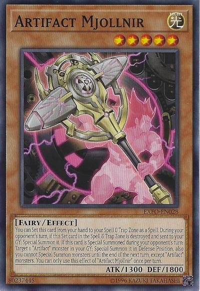 You can Set this card from your hand to your Spell & Trap Zone as a Spell. During your opponent’s turn, if this Set card in the Spell & Trap Zone is destroyed and sent to your GY: Special Summon it. If this card is Special Summoned during your opponent’s turn: Target 1 ‘Artifact’ monster in your GY; Special Summon it in Defense Position, also you cannot Special Summon monsters until the end of the next turn, except ‘Artifact’ monsters. You can only use this effect of ‘Artifact Mjollnir’ once per turn.