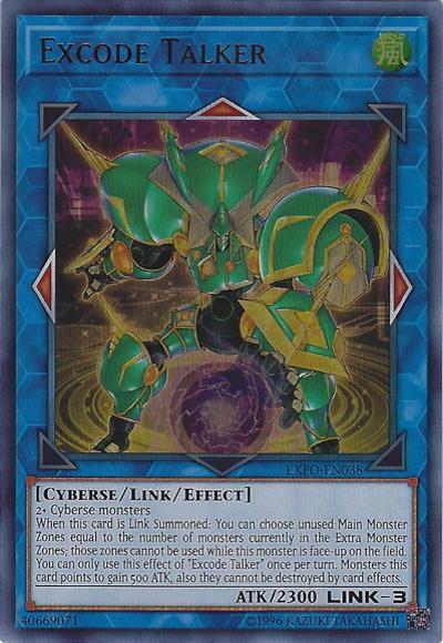 2+ Cyberse monstersWhen this card is Link Summoned: You can choose unused Main Monster Zones equal to the number of monsters currently in the Extra Monster Zones; those zones cannot be used while this monster is face-up on the field. You can only use this effect of ‘Excode Talker’ once per turn. Monsters this card points to gain 500 ATK, also they cannot be destroyed by card effects.