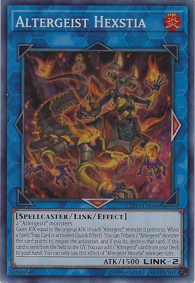 2 ‘Altergeist’ monstersGains ATK equal to the original ATK of each ‘Altergeist’ monster it points to. When a Spell/Trap Card or effect is activated (Quick Effect): You can Tribute 1 ‘Altergeist’ monster this card points to; negate the activation, and if you do, destroy that card. If this card is sent from the field to the GY: You can add 1 ‘Altergeist’ card from your Deck to your hand. You can only use this effect of ‘Altergeist Hexstia’ once per turn.