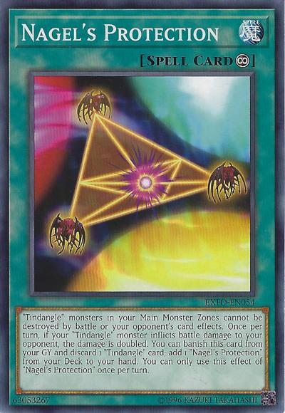 ‘Tindangle’ monsters in your Main Monster Zones cannot be destroyed by battle or your opponent’s card effects. Once per turn, if your ‘Tindangle’ monster inflicts battle damage to your opponent, the damage is doubled. You can banish this card from your GY and discard 1 ‘Tindangle’ card; add 1 ‘Nagel’s Protection’ from your Deck to your hand. You can only use this effect of ‘Nagel’s Protection’ once per turn.