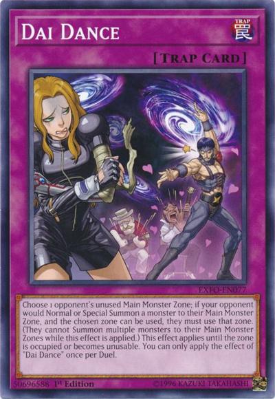 Choose 1 opponent’s unused Main Monster Zone; if your opponent would Normal or Special Summon a monster to their Main Monster Zone, and the chosen zone can be used, they must use that zone. (They cannot Summon multiple monsters to their Main Monster Zones while this effect is applied.) This effect applies until the zone is occupied or becomes unusable. You can only apply the effect of ‘Dai Dance’ once per Duel.