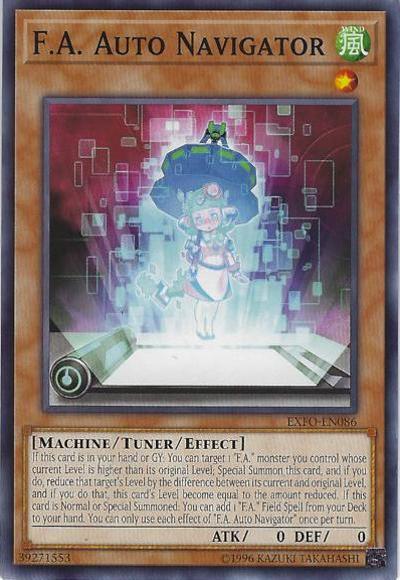 If this card is in your hand or GY: You can target 1 ‘F.A.’ monster you control whose current Level is higher than its original Level; Special Summon this card, and if you do, reduce that target’s Level by the difference between its current and original Level, and if you do that, this card’s Level become equal to the amount reduced. If this card is Normal or Special Summoned: You can add 1 ‘F.A.’ Field Spell from your Deck to your hand. You can only use each effect of ‘F.A. Auto Navigator’ once per turn.