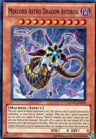 Cannot be Normal Summoned/Set. Must first be Special Summoned (from your hand) by controlling 3 or more ‘Meklord’ monsters. When this card is Special Summoned: You can target any number of ‘Meklord’ monsters you control, except this card; send those targets to the Graveyard, and if you do, this card’s ATK becomes the combined original ATK of the monsters sent to the Graveyard by this effect. Each time a Synchro Monster(s) is Special Summoned: Inflict 1000 damage to the Summoning player.