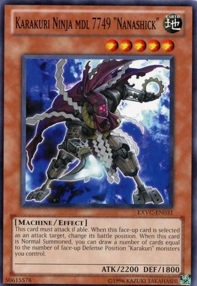 This card must attack if able. When this face-up card is selected as an attack target, change its battle position. When this card is Normal Summoned, you can draw a number of cards equal to the number of face-up Defense Position ‘Karakuri’ monsters you control.