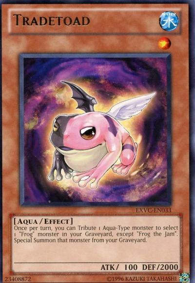 Once per turn, you can Tribute 1 Aqua-Type monster to select 1 ‘Frog’ monster in your Graveyard, except ‘Frog the Jam’. Special Summon that monster from your Graveyard.